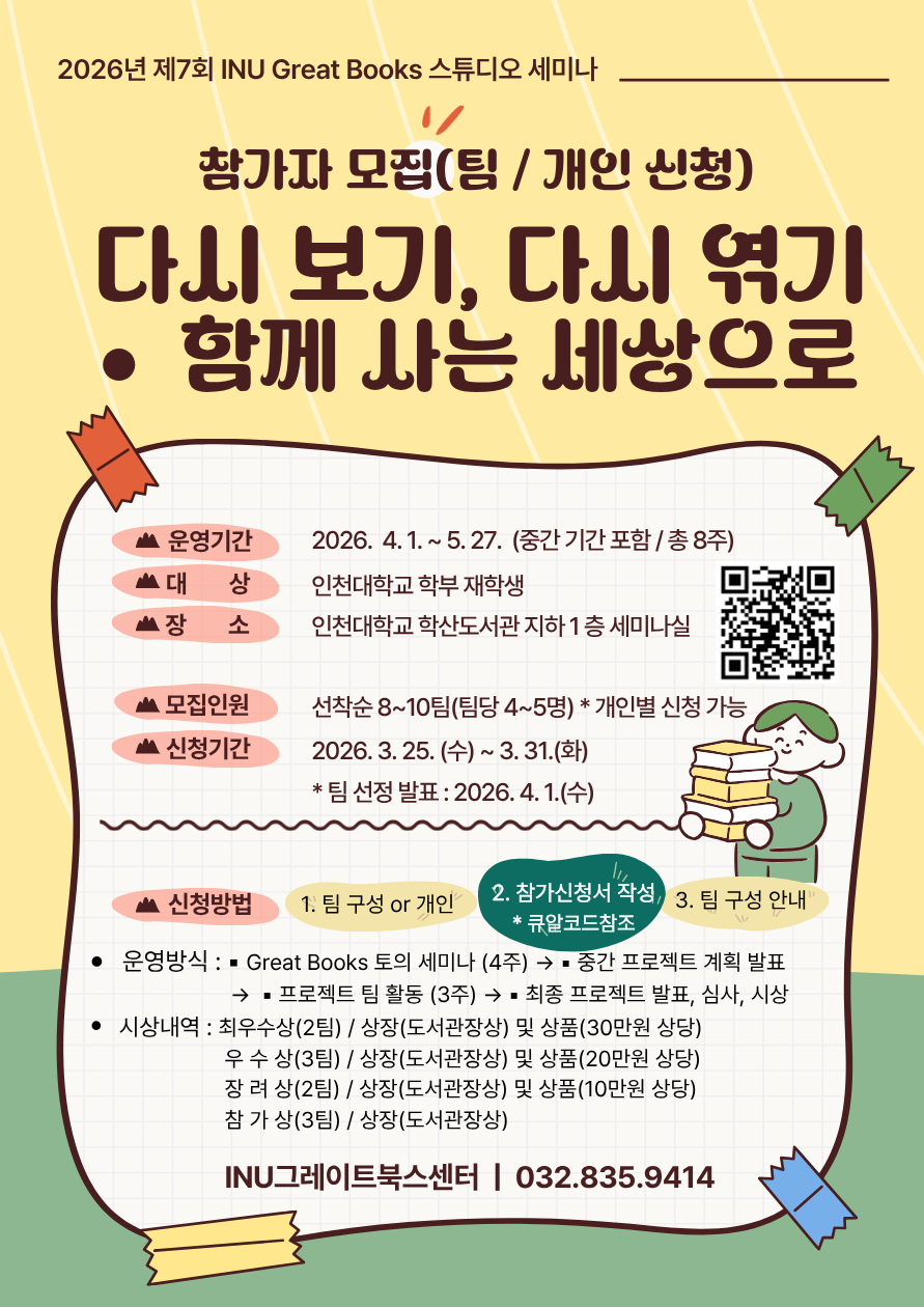 INU 그레이트북스 센터에서「제7회 INU Great Books 스튜디오 세미나」를 아래와 같이 개최하오니, 학생들의 많은 참여 바랍니다.